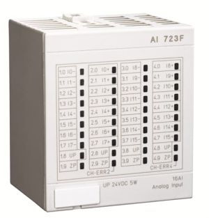 The analog input module AI 723F comes with 16 input channels in two groups. Each of these channels can be individually configured depending on its intended usage. Possible applications are sensing a voltage (0…10 V or -10…+10 V), sensing a current (0…20 mA or 4…20 mA), or temperature measurement (platinum or nickel resistance thermometers Pt100, Pt1000, Ni1000) in two- or three-wire configuration.